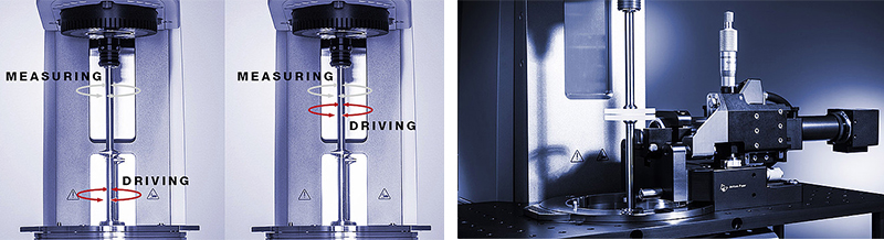在反向运动模式下,流变仪将两套空气轴承 EC 马达均用作驱动装置和扭矩传感器。两个马达可以轻松设置为以相反方向旋转,这可以用来在测量样品中形成固定的停滞面,以便采用显微镜进行剪切条件下材料的先进结构分析。此模式也可以与通用拉伸夹具结合使用,以便在最小的测量扭矩下进行拉伸测量。就速度而言,反向运动模式更让测量工作“事半功倍” — 最高速度差高达 6000 rpm,这大大拓宽了高剪切应用的剪切速率范围。