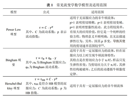 在对物质的流变学特征进行测定后,可以使用数学模型对测定结果进行拟合,寻找与样品的流变学特征相吻合的数学模型,计算出可以表征样品流变学特征的关键参数。在稳态流变学研究中,目前常用的流变学数学模型有Power Low 模型、Bingham模型、Herschel-Bulkley模型和Carreau/Yasuda模型[48]。