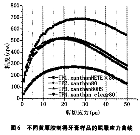 (3)屈服应力可体现牙膏的制造和包装容易性,4 一xanthan clear80 更容易运输, 洗刷分散性更好,更容易从牙膏管中挤出。
